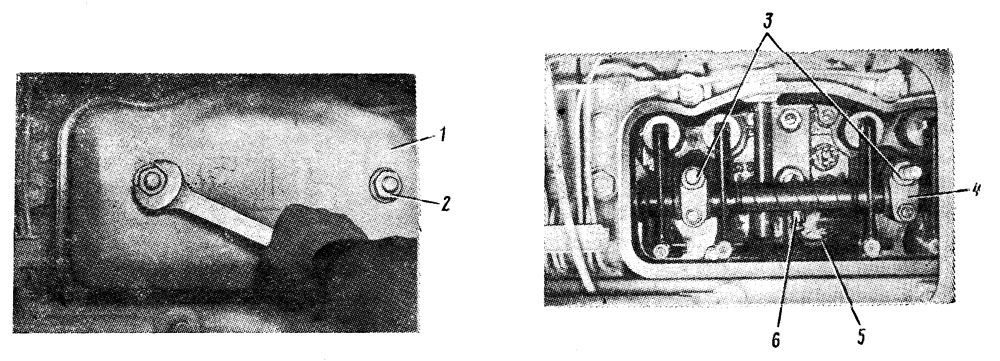 Снимите заднюю крышу капота. Отверните гайки 2 (рис. 49) и снимите колпаки 1 головок цилиндров. Отсоедините трубки 5 подвода масла от штуцеров 6 валиков коромысел. Отверните со шпилек гайки 3 крепления стоек коромысел и снимите стойки 4 вместе с валиками и коромыслами. После снятия коромысел клапанов снимите штанги толкателей и штанги декомпрессора.