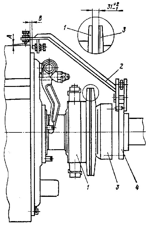 Застропите дизель подъемным приспособлением и установите на лонжероны, предварительно подложив под лапы передней опоры и задние лапы дизеля прокладки 2 и 5. Установите размер 31±2 мм между сдвинутой вперед до упора муфтой включения 1 (рис. 10) и тормозком муфты 3, присоединенной к фланцу 4 верхнего вала коробки передач.