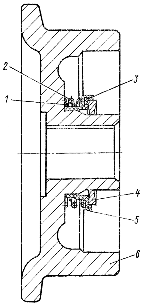 Снимите со ступицы роликов 6 ( рис. 287 ) кольца 4 торцового уплотнения. Снимите манжеты 3 с пружинными кольцами 1, пружины 2 и обоймы 5. Выньте из крышек 9 ( см. рис. 286 ) вторые кольца 4 торцового уплотнения и прокладку 3.