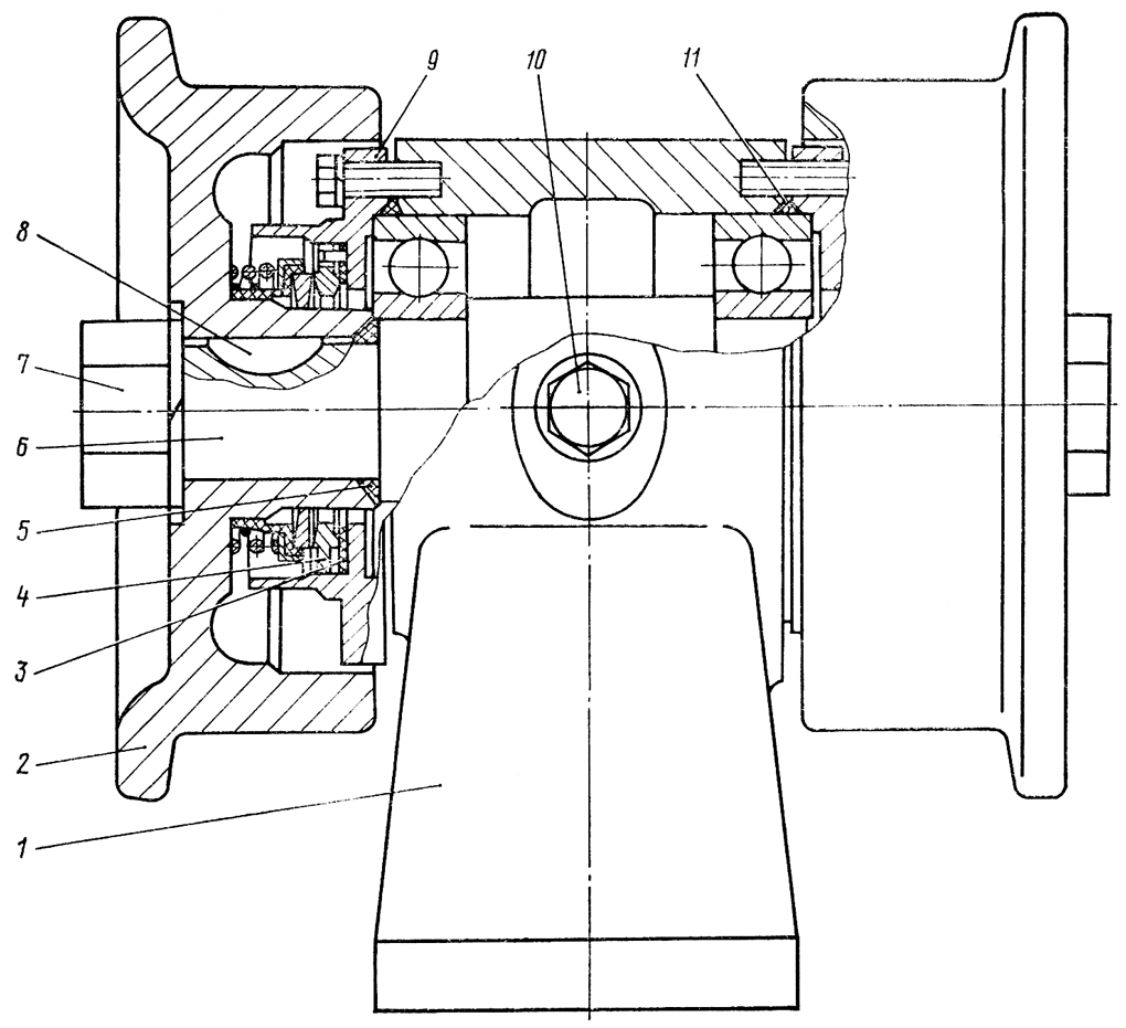 Отверните болты крепления крышек 9 и снимите крышки. Снимите с оси и с подшипников уплотнительные кольца 5 и 11.