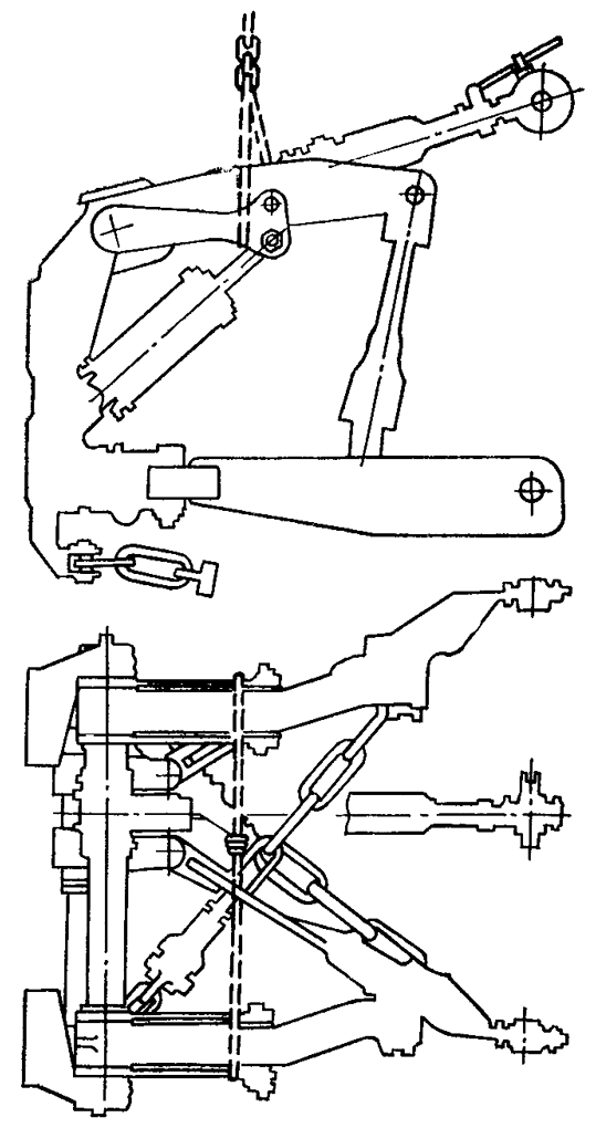 Прикрепите приспособлением ( рис. 333 ) механизм навески к подъемнику. Масса механизма навески 1135 кг. Отверните десять гаек 1 ( см. рис. 332 ) со шпилек крепления механизма 4 навески и снимите механизм навески с трактора. Отверните накидные гайки рукавов 5 высокого давления, снимите рукава. Снимите при необходимости трубы 2, отвернув накидные гайки. Закройте заглушками (из ЗИП) концы труб и штуцеров гидроцилиндров во избежание попадания грязи.