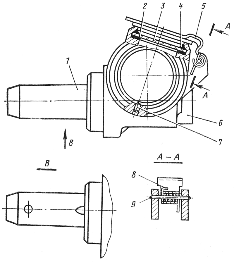 Вставьте в отверстие ушка крышки 5 циферблата пружину 8. Заведите один конец пружины в прорезь ушка крышки и заверните пружину на один-два оборота. Вставьте крышку в паз между приливами на корпусе работомера так, чтобы длинный конец пружины упирался в корпус. Соедините крышку циферблата с приливами корпуса работомера штифтом 9. Концы штифта расклепайте. Крышка циферблата должна плотно приживаться к корпусу работомера.