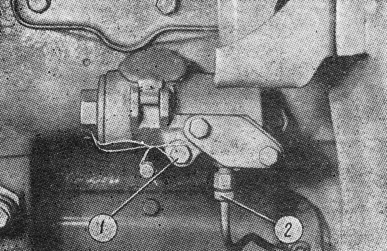 Отсоедините от работомера вентиляционную трубку 2 ( рис. 143 ). Выверните два болта 1 крепления и снимите работомер с прокладкой с корпуса регулятора.