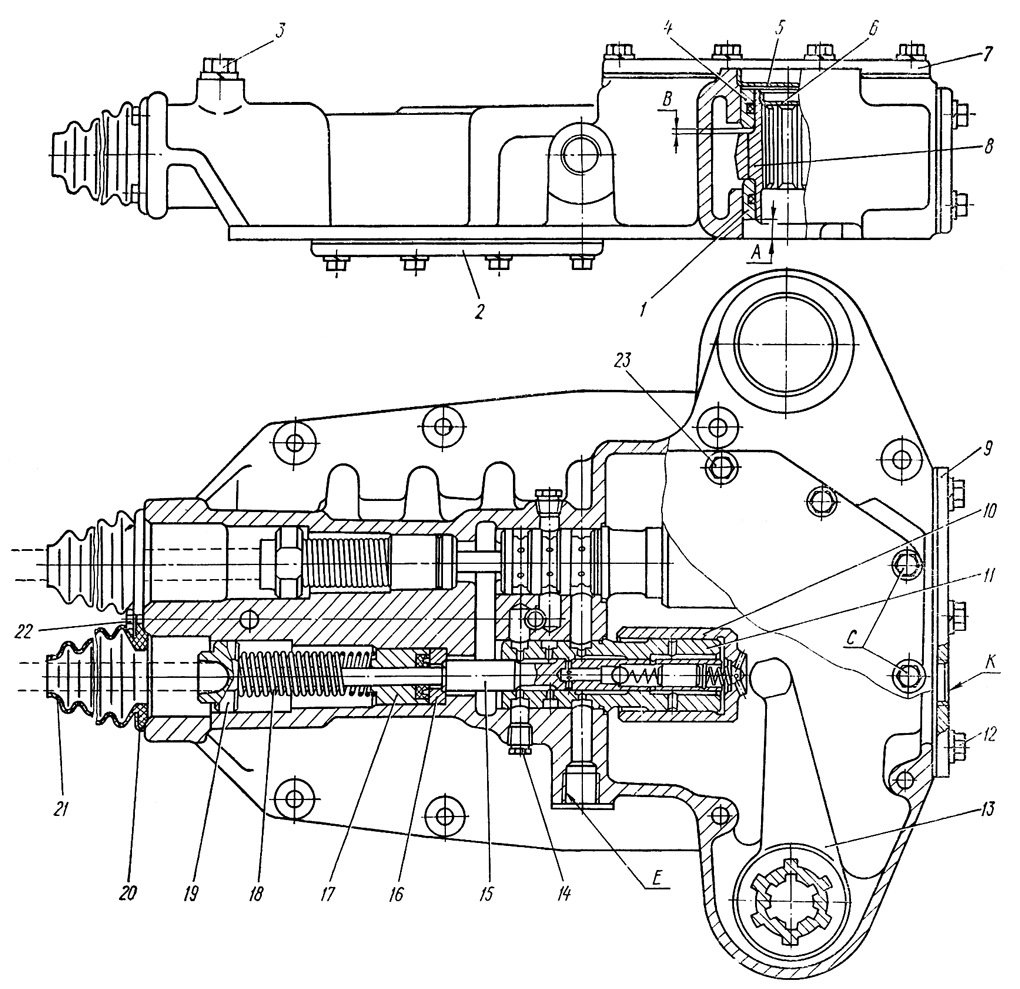 Отверните девять болтов 23 и снимите верхнюю крышку 7. Выпрессуйте оправкой две муфты 8 вместе с верхними втулками 4 и заглушками 5 из корпуса сервомеханизма. Выньте рычаги l3 из корпуса. Выбейте из муфты заглушки 6. Снимите поршни 10 с гильз 11.