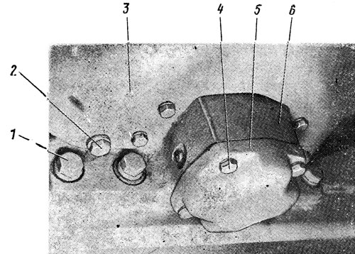 Поднимите корпус 6 бортовых фрикционов и подставьте под него надежную опору. Выверните шесть болтов 2 крепления защитного щитка и снимите щиток 3. Выверните четыре болта 4 креплений крышки концевого подшипника и снимите крышку 5 с прокладками.