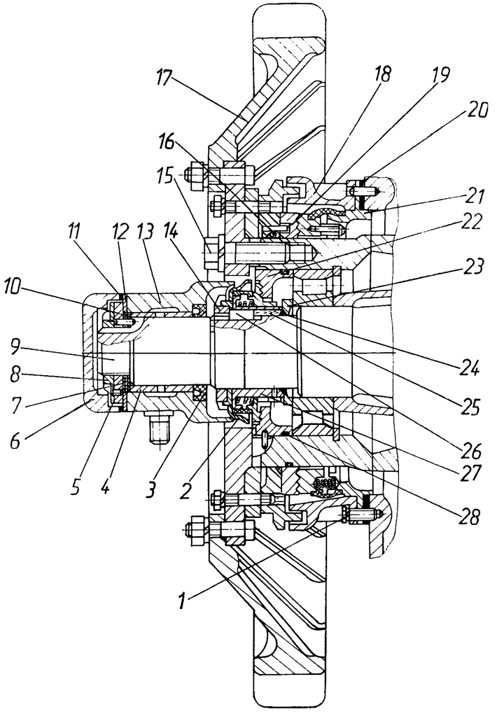Расстопорите и отверните гайку 14 с полуоси. Снимите козырек 2 и втулку 27 в сборе с диском. Выньте съемником из ступицы диск 22 уплотнения, используя три технологических отверстия М8.
