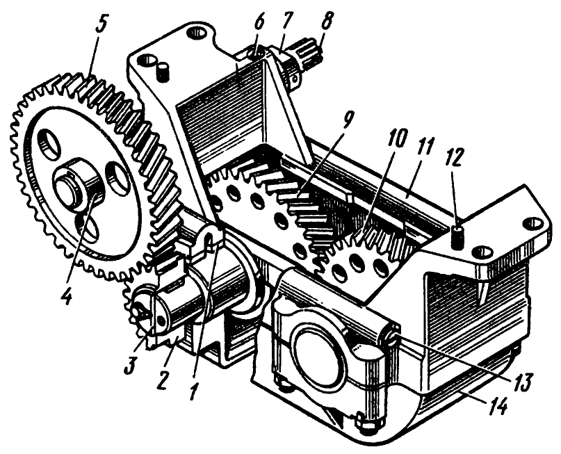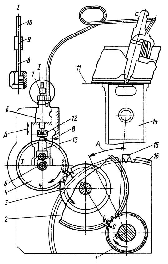 Если топливный насос снят с двигателя, момент начала подачи топлива можно установить следующим образом: шестерню привода ставят так, чтобы расстояние В от середины впадины, отмеченной керном и цифрой 1 до привалочной плоскости корпуса регулятора было равно 73 ± 0,4 мм для двигателя Д-160 и 72 ± 0,4 мм — для двигателя Д-160Б. При этом от верхней плоскости корпуса насоса до опорного торца хвостовика толкателя должно быть 45,5 ± 0,05 мм. Далее, поворачивая валик насоса по часовой стрелке, точно так же устанавливают хвостовик у остальных секций насоса в порядке их работы (1—3—4—2).