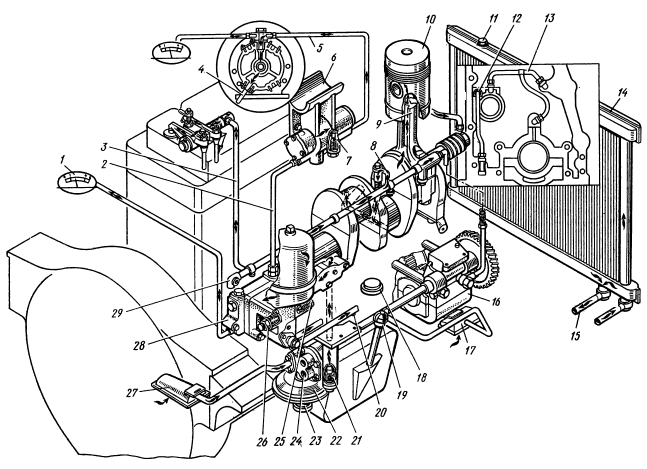 Затем запускают дизель, наружный рычаг регулятора устанавливают в положение, соответствующее максимальной подаче топлива (рычаг акселератора передвигают в крайнее верхнее положение).