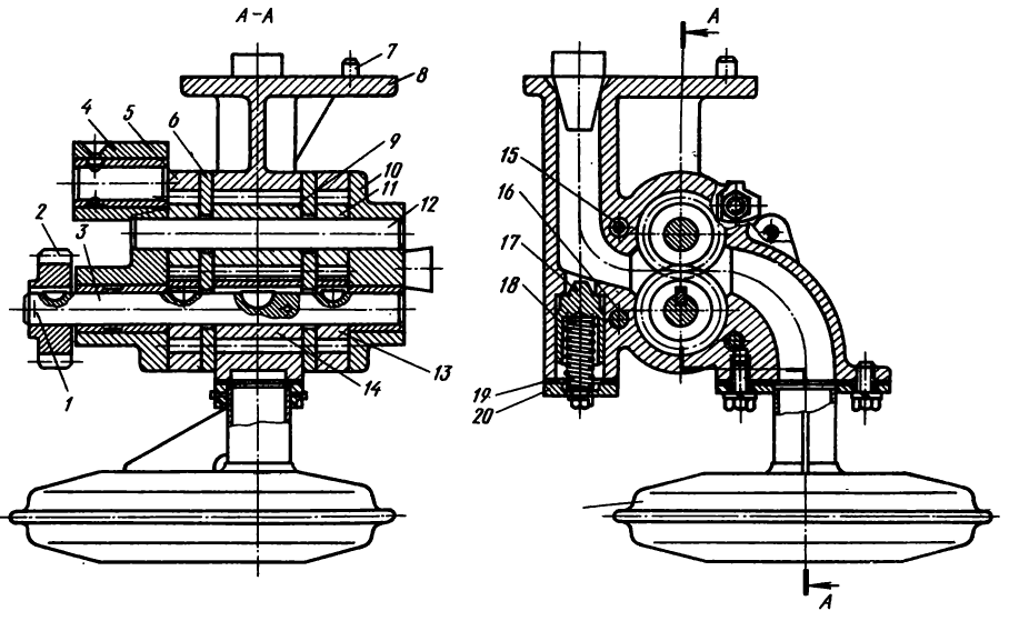 Регулирующая муфта при этом должна соприкасаться с пружиной корректора без деформации пружины (подложить под пружину щуп толщиной 2,8 мм для двигателя Д-160 и 3,6 мм — для двигателя Д-160Б); грузики регулятора прижаты к вертикальному валику, а подвижная муфта регулятора — к роликам рычагов (торец муфты не должен доходить до сухариков грузиков на 1,5—3 мм).