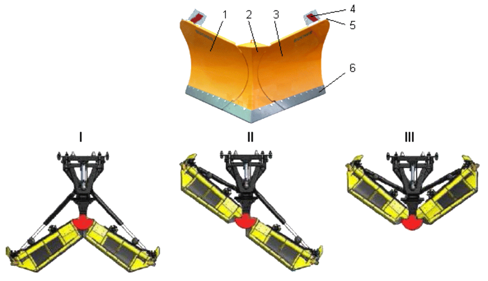 • Отвал фронтальный снегоочистительный имеет разделяемую на две части лопату, которая может устанавливаться в три разных положения: